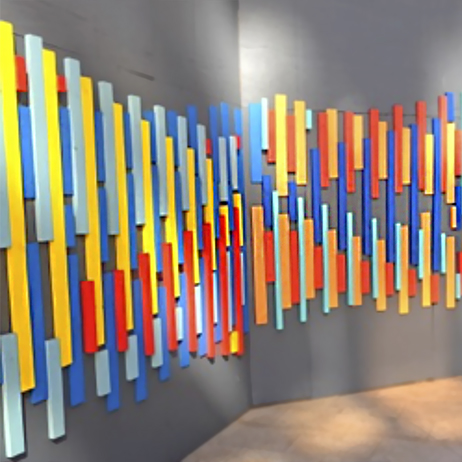 que se puede mirar a distancia, pero que es fascinante al apreciarlo desde la misma fibra. Los hilos o hebras son reemplazados por listones de madera, en donde el relieve, la trama, y en especial la interacción de color, son protagónicos.